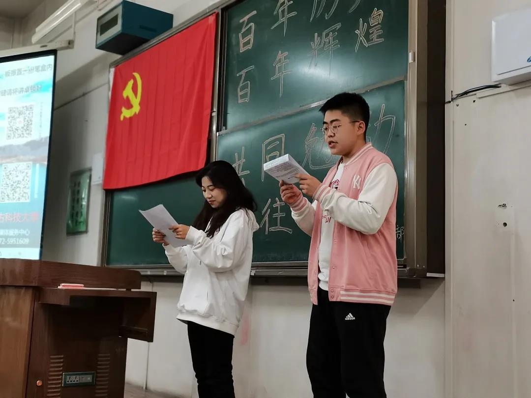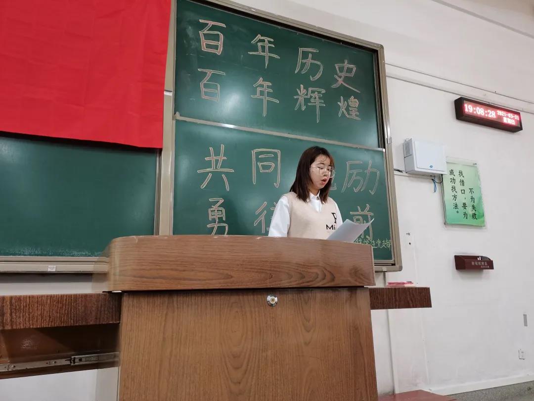 百年风雨兼程,世纪沧桑巨变。今年是中国共产党成立100周年,在一百年的非凡奋斗历程中,一代又一代中国共产党人顽强拼搏、不懈奋斗,涌现了一大批视死如归的革命烈士、一大批顽强奋斗的英雄人物、一大批忘我奉献的先进模范,形成了一系列伟大精神,构筑起了中国共产党人的精神谱系。为了让同学们更深刻的了解党的这伟大的一百年,通信电信员工党支部于2021年03月21日晚上7:00在主教F208举行了主题为“百年历史,百年辉煌”的支部党课。本次党课的主持人是邓宇琪同学和王章屹同学。
